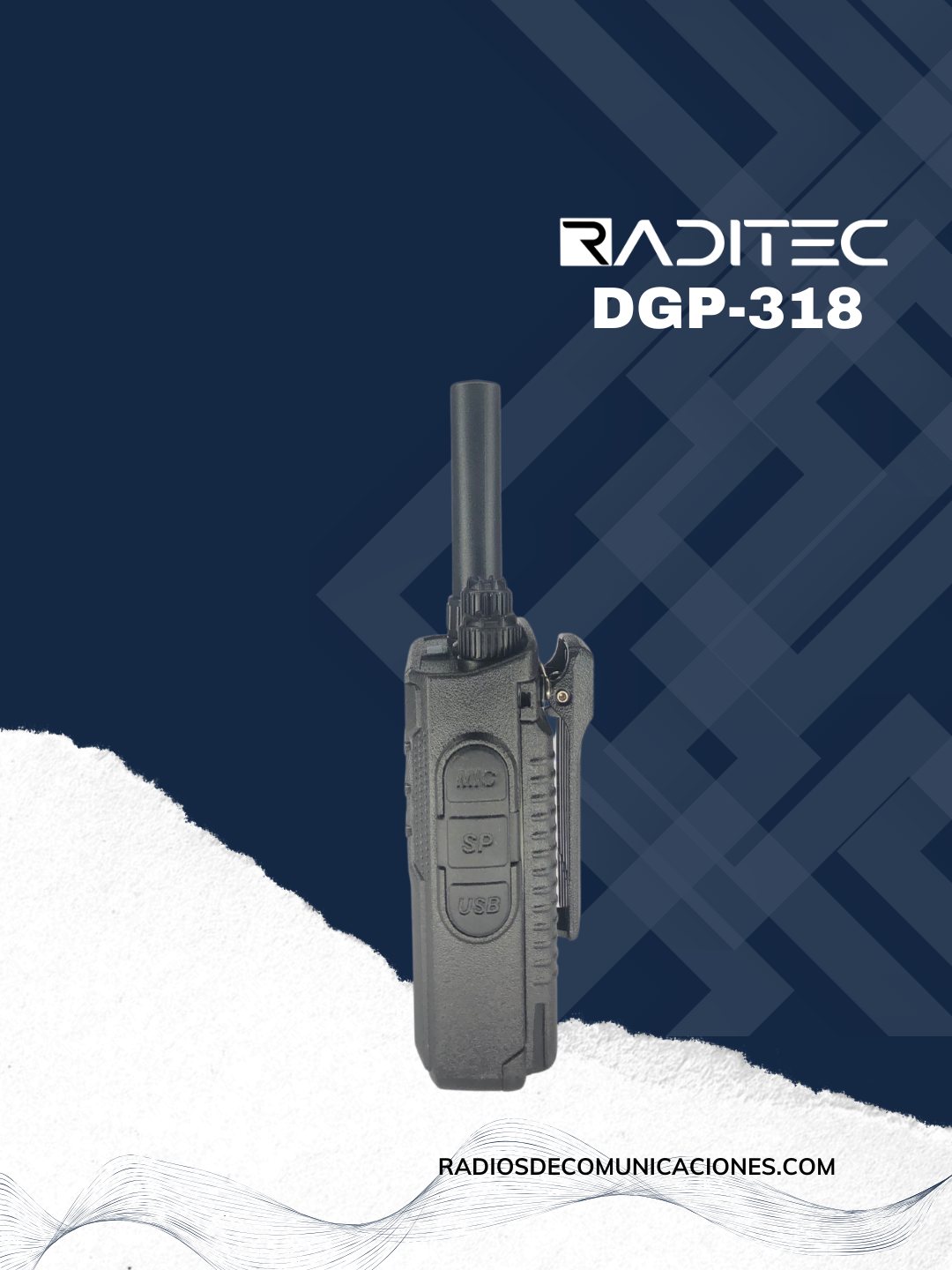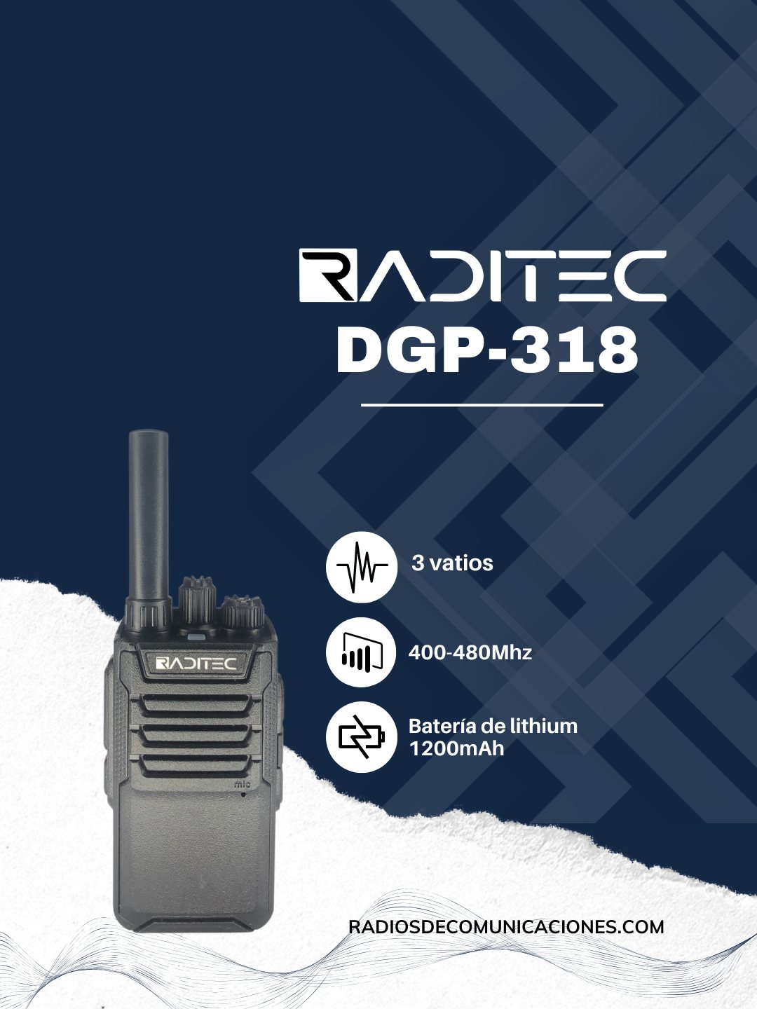 Radio de 16 canales de 3 vatios, bidireccional con funciones de Codificador de 8 grupos, Comparador de voz, Radio FM incorporada, Temporizador de tiempo de espera, Transmisión por voz manos libres (VOX), Conmutable de alta / baja potencia, Anuncio de voz, Codificación y descodificación DTMF, Función de espectro ensanchado por salto de frecuencia