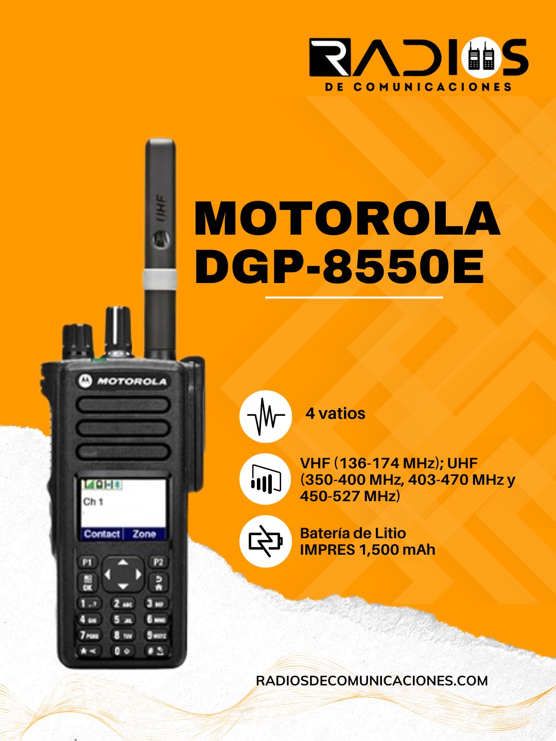 El radio DGP™8050/5050 está disponible en bandas de frecuencia UHF y VHF e incluye soporte para hasta 32 canales, tres botones programables, botón de emergencia, especificaciones IP57 para sumergibilidad y opción de seguridad intrínseca FM.