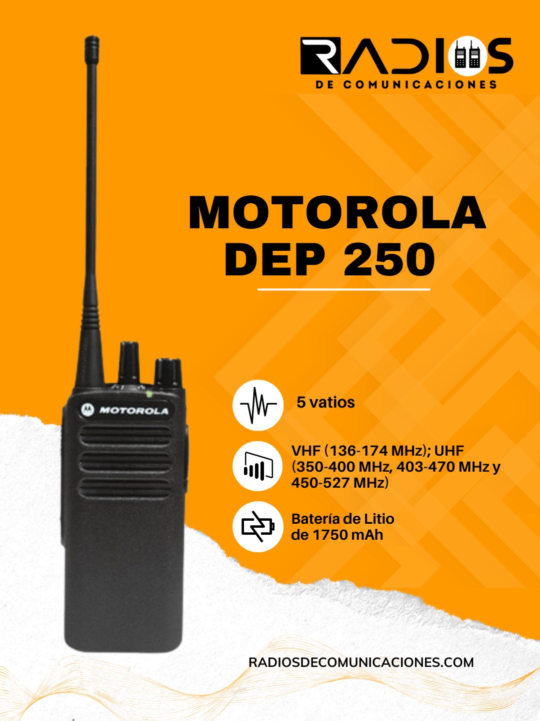 El radio MOTOTRBO DEP 250 ofrece los beneficios de la tecnología digital: en modo digital, 40% más de tiempo de conversación, capacidad de doble voz de 12.5kHz de ancho de banda y mejor rendimiento de audio que los equipos analógicos. Su radio MOTOTRBO proporcionará una comunicación de voz más clara en todo el rango de llamadas, eliminando el ruido estático y de fondo en el modelo analógico.